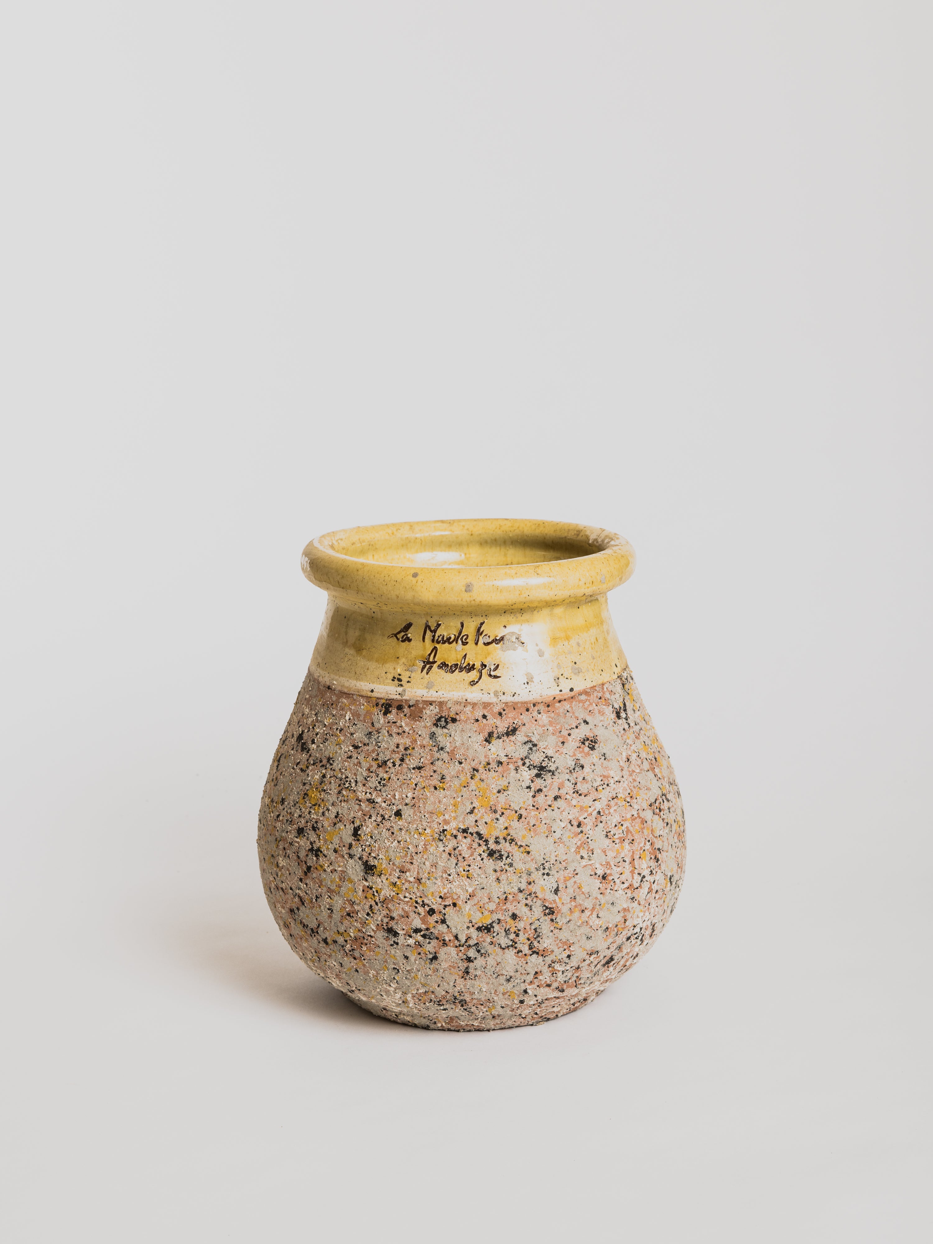 Tämä kauniisti pisaramuotoinen Biot-ruukku on saanut Provence-patinan ja emaloidun keltaisen kauluksen. Se on käsintehty Anduze-alueella Etelä-Ranskassa. Ruukussa on tyhjennysreikä, eikä se kestä pakkasta.