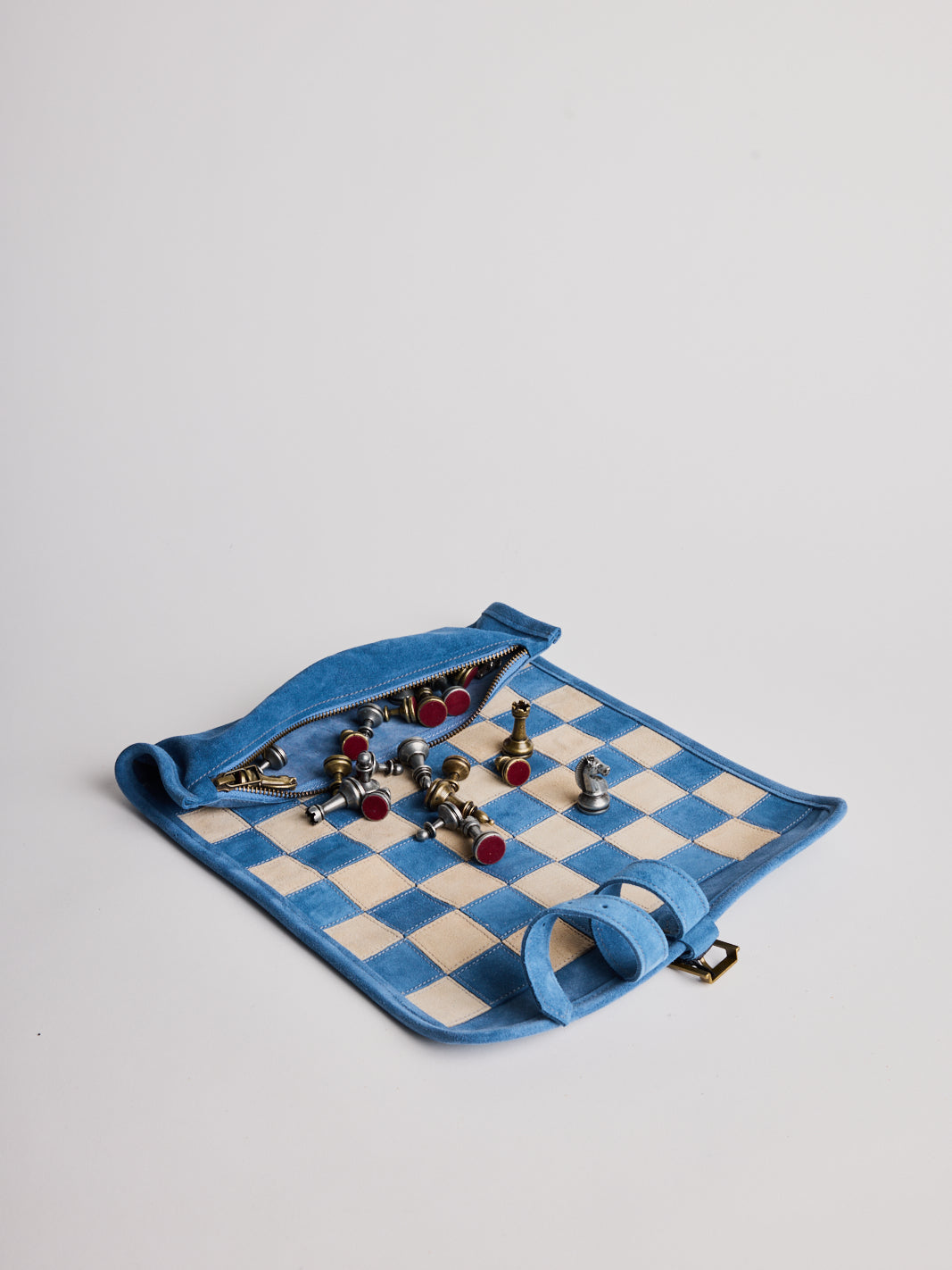 Handmade Travel Size Chess Set With Metal Chessmen & Denim Blue