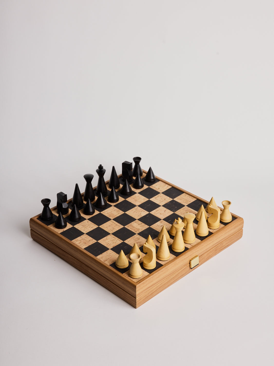 Black Natural Cork Chessboard Inlaid on wooden box with natural & Set ebonised chessmen